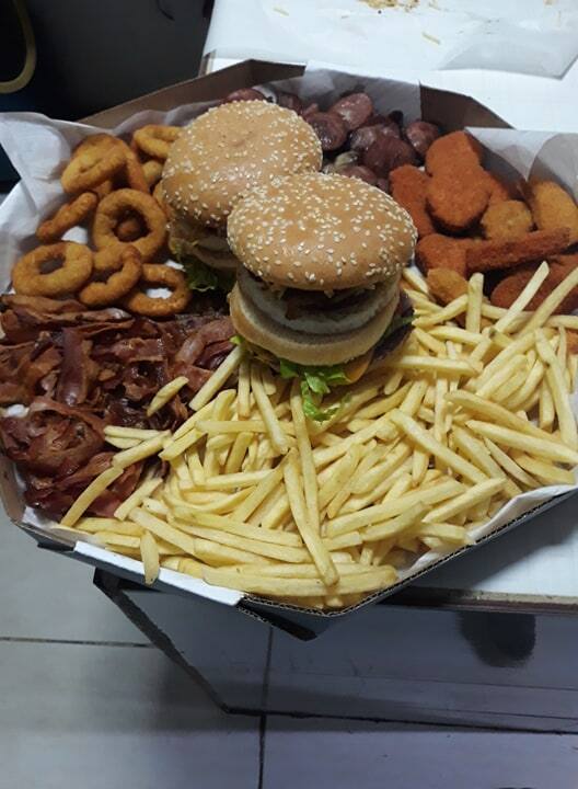 4 hamburguês Simples ou 2 X-tudos, batata frita, bacon, onion, linguiça calabresa e nuggets (Embalagem de pizza 45 Cm)